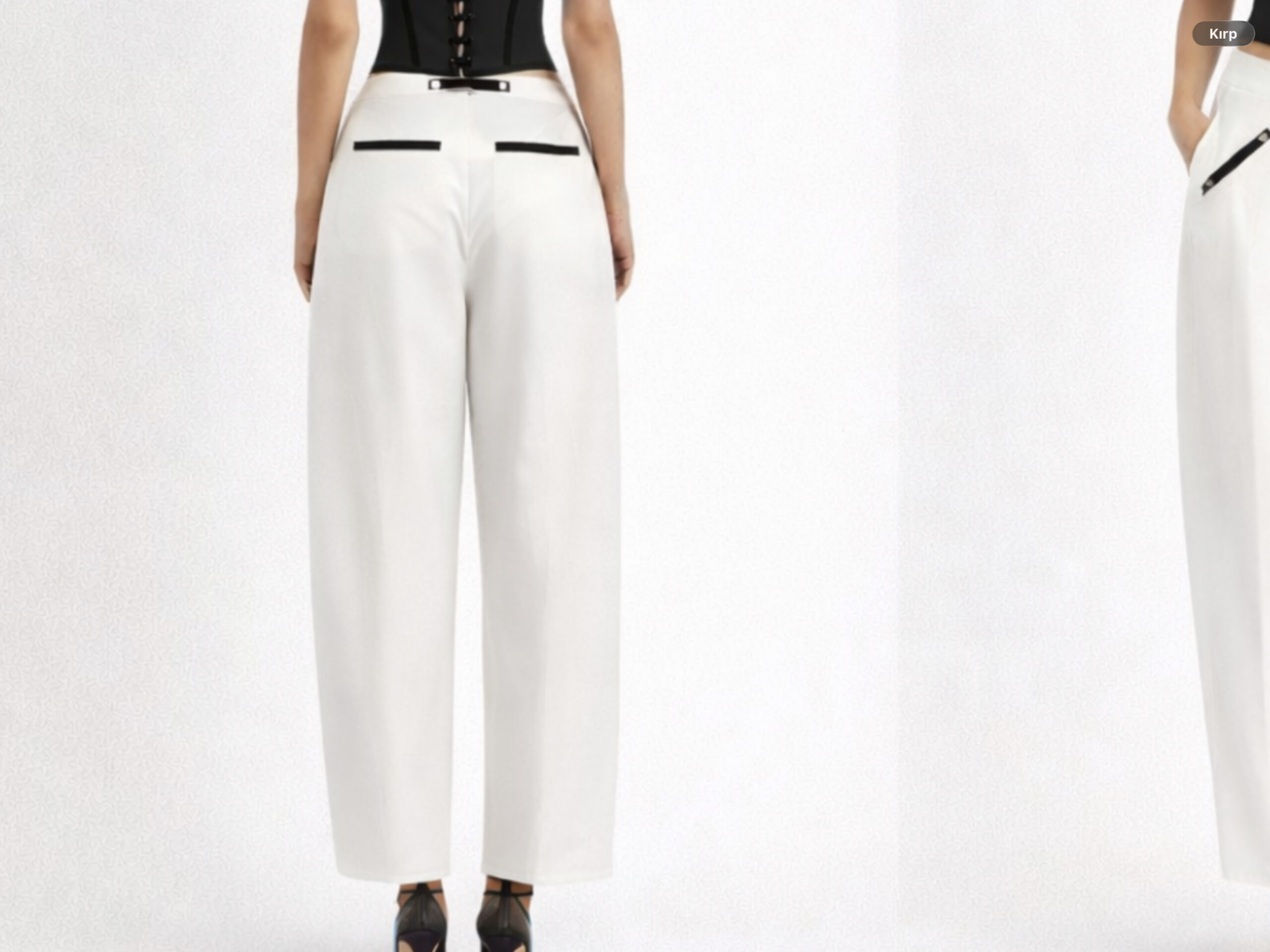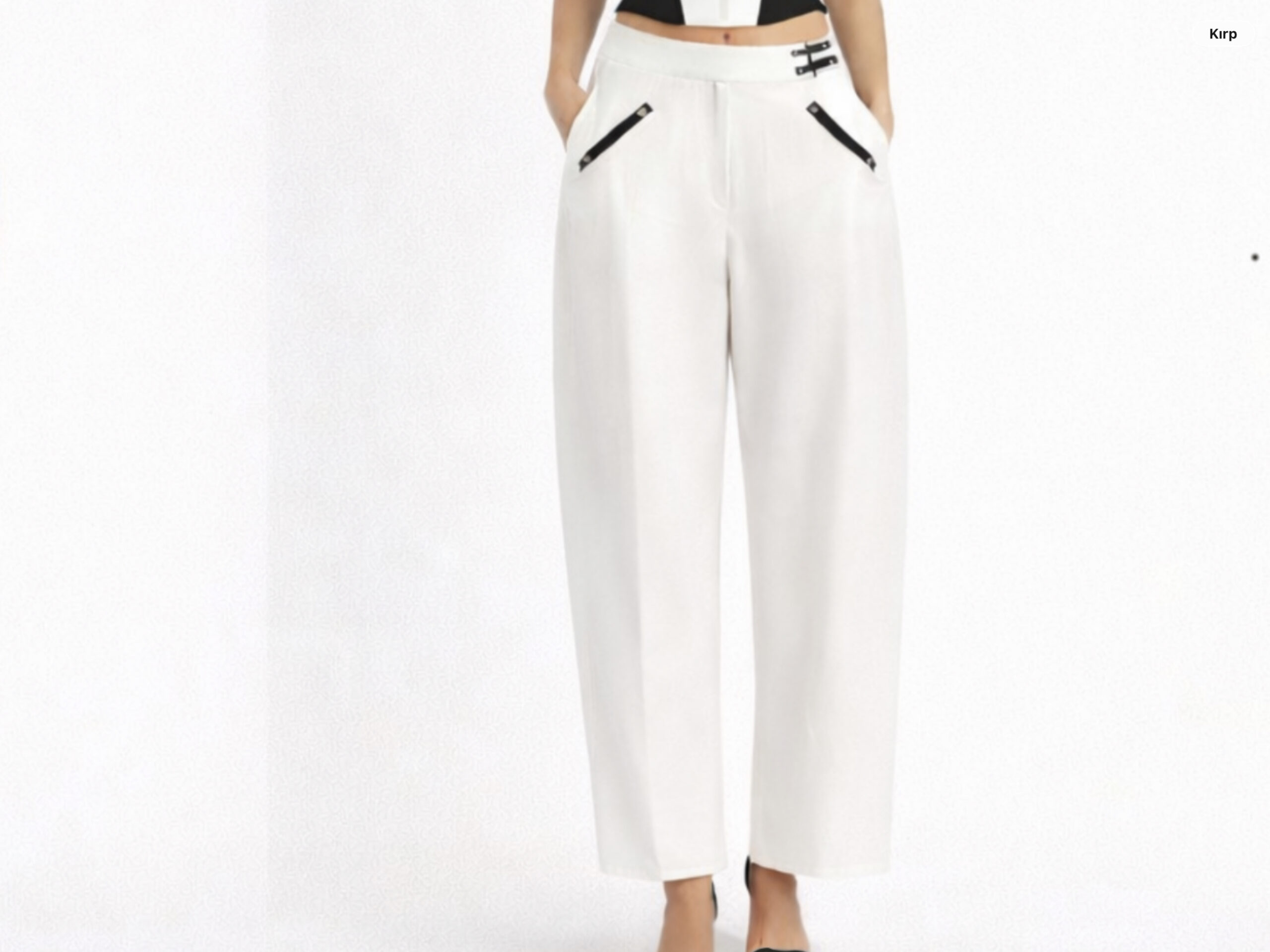 Yüksek bel geniş paça pantolon ise modern ve minimal çizgiyi metal fermuar detaylarıyla tamamlar. Eğik cep fermuarları ve beldeki ince tokalı bant, tasarıma güçlü ve karakteristik bir görünüm kazandırır.